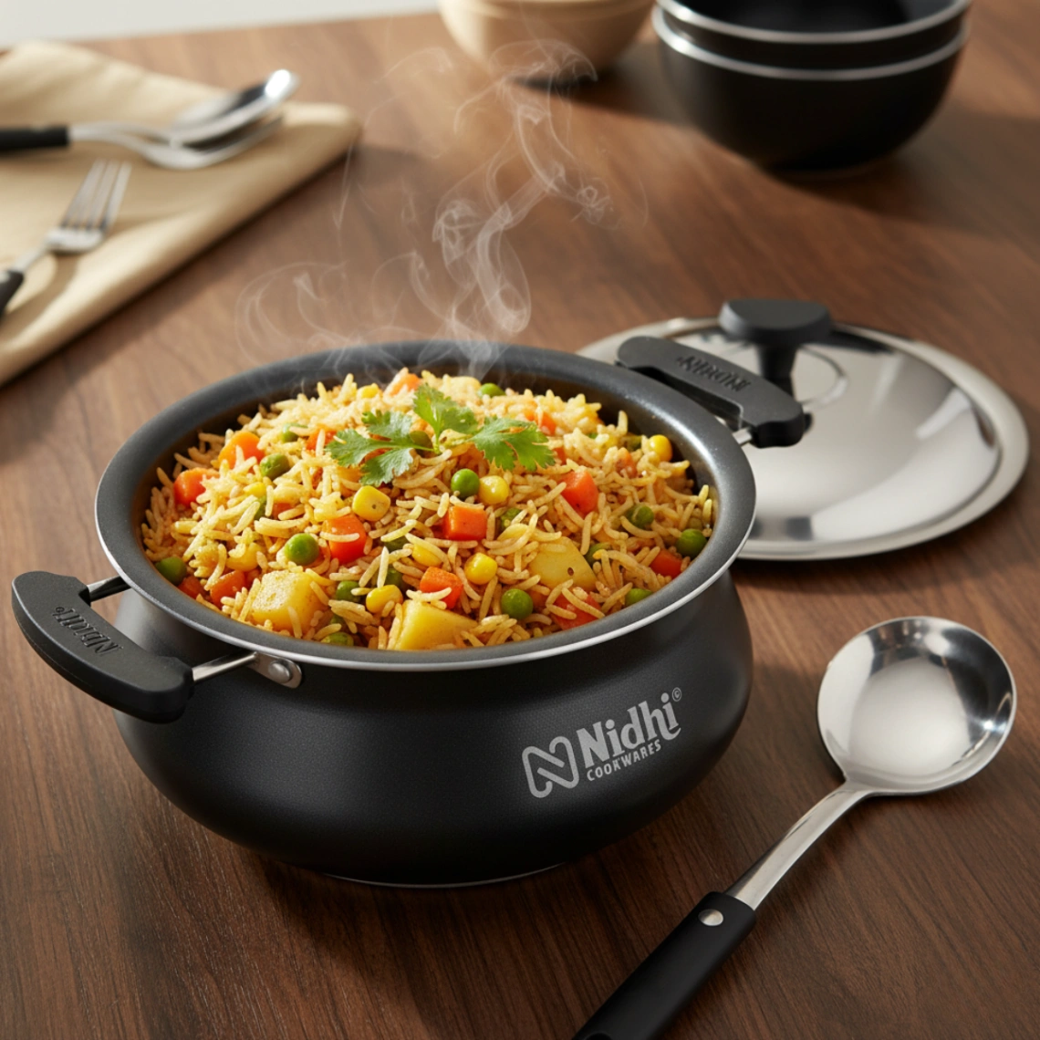 - The Handi is designed for traditional Indian cooking – ideal for biryani, pulao, curries, dals, gravies, and rice dishes.