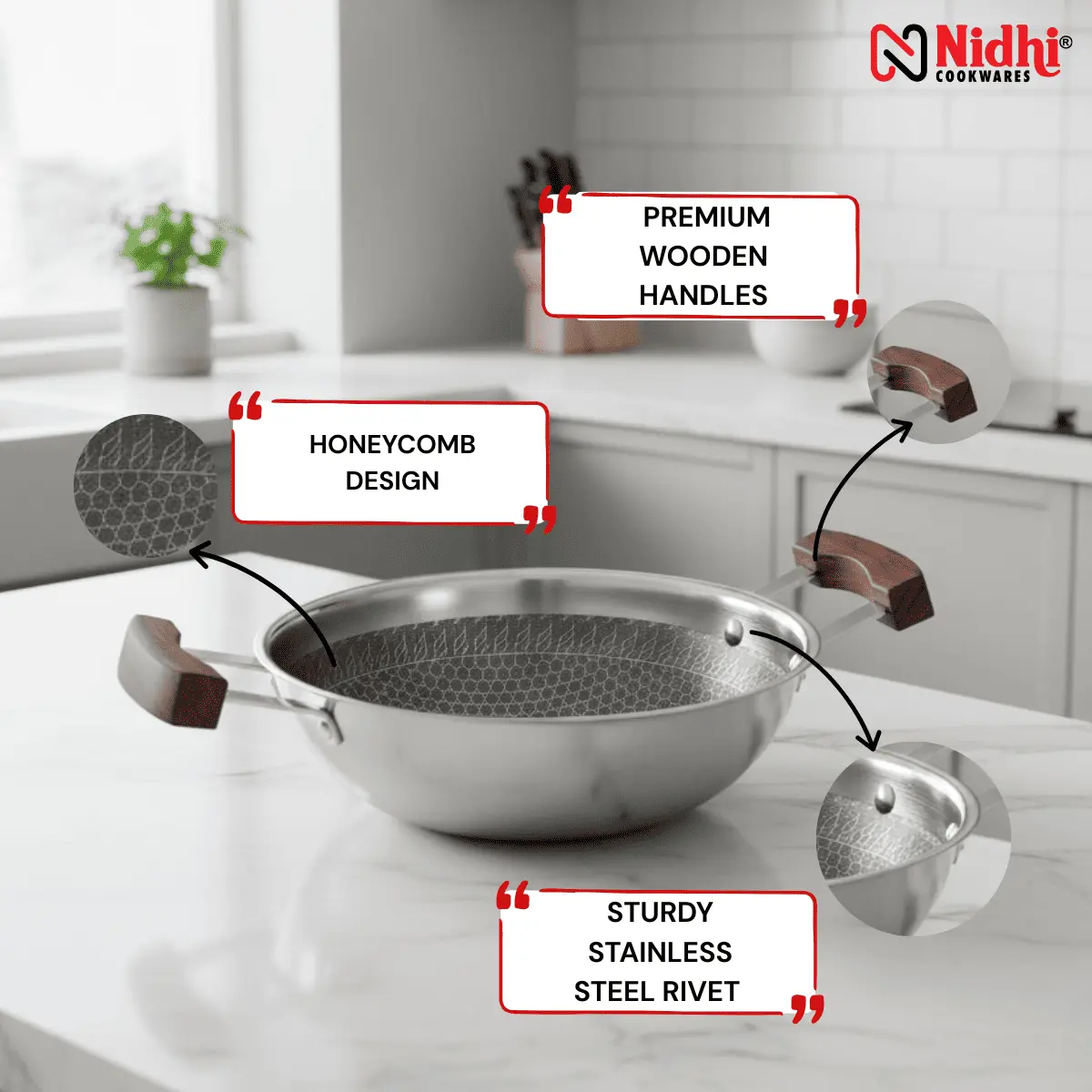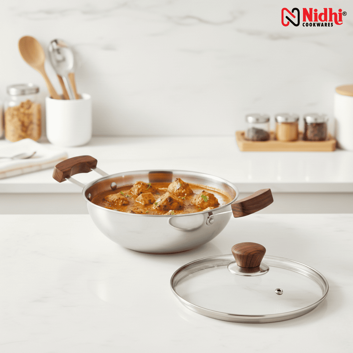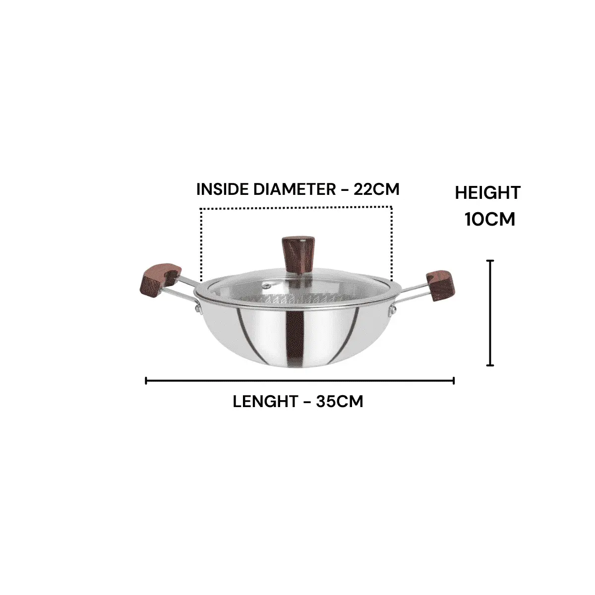 - Aesthetic Appeal: The combination of polished stainless steel and natural wood accents makes this Kadai a centerpiece on your dining table. Serve directly from stove to table with style.