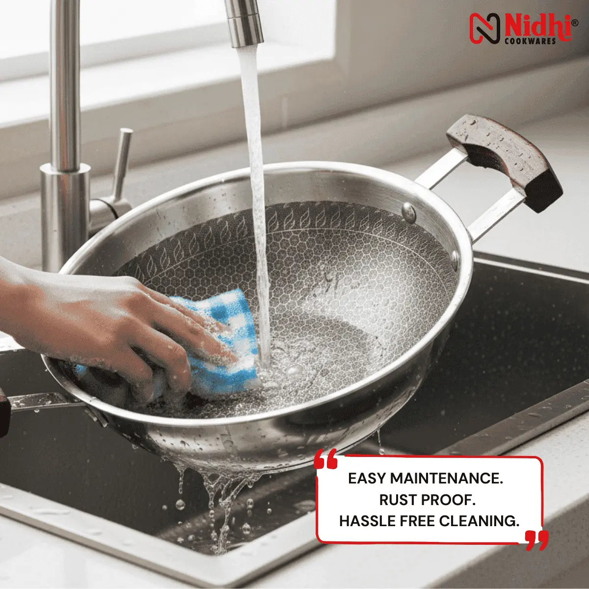 - REVOLUTIONARY HYBRID HONEYCOMB STRUCTURE: Unlike ordinary non-stick cookware, our deep kadai features a laser-etched hexagon pattern. The raised stainless steel matrix protects the non-stick coating from scratches and abrasion, making it 100% metal-spoon friendly and incredibly durable for daily heavy-duty cooking.